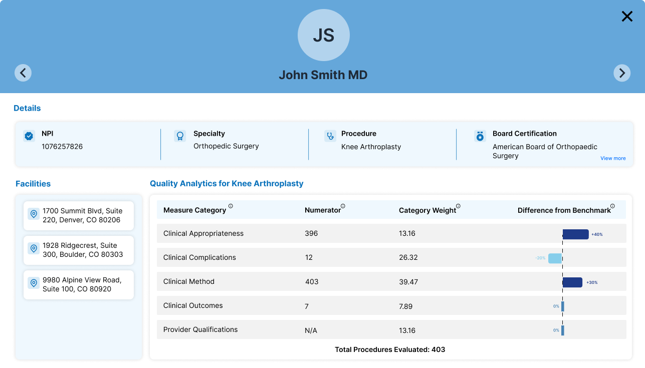 We use over 300 quality measures to evaluate surgeon performance such as infection and revision rates. The measures are tailored to each procedure as surgery is not one-size-fits-all.